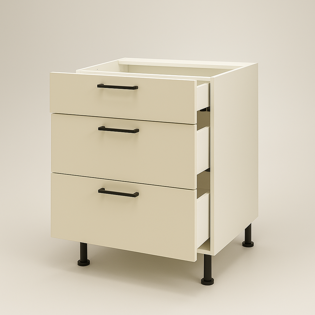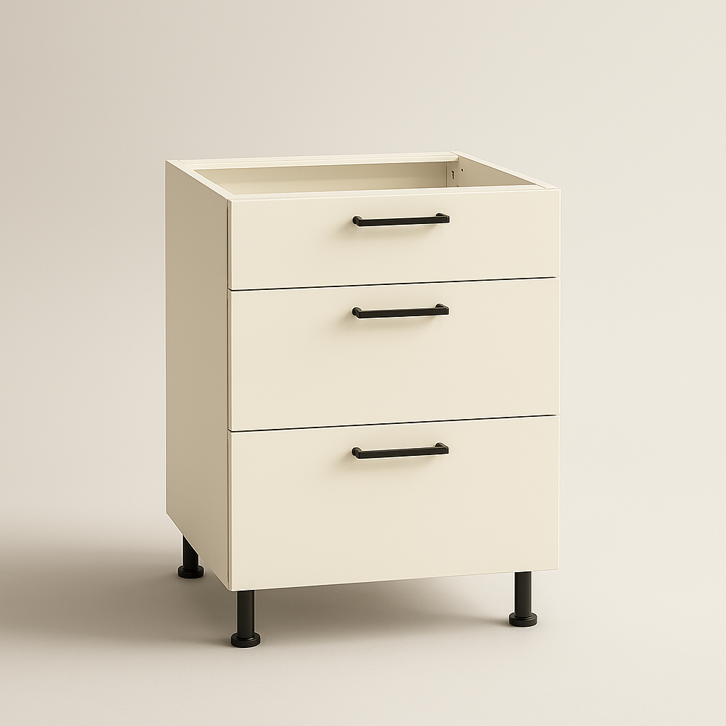 Corp de bucătărie cu 3 sertare spațioase, fronturi din MDF melaminat crem lucios și dimensiuni standard de 86.2 x 60 x 52.8 cm. Carcasa este realizată din PAL melaminat alb neted Egger 18 mm, ce oferă rezistență și durabilitate. Sertarele sunt echipate cu glisiere cu șină / cadru metalic de calitate superioară pentru o culisare lină și silențioasă, iar stabilitatea este asigurată de picioarele reglabile Hafele Axilo 78 și elementele de legătură Minifix Hafele.