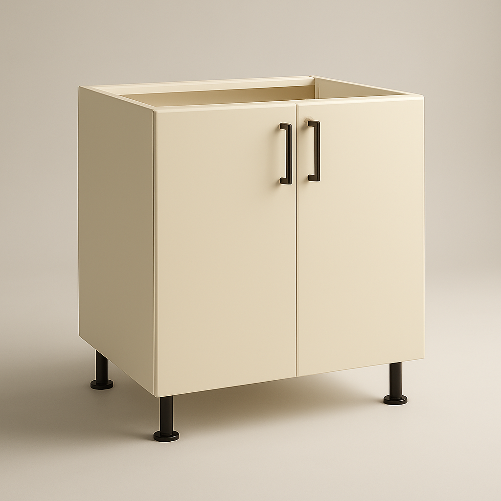 Corp de bucătărie cu 2 uși din MDF melaminat crem lucios, dimensiuni 86.2 x 80 x 52.8 cm. Construcție robustă pe carcasă din PAL melaminat alb neted Egger de 18 mm, cu balamale Blum Expando pentru deschidere lină și durabilitate maximă. Stabilitatea este asigurată de picioarele reglabile Hafele Axilo 78 și de elementele de legătură Minifix Hafele, ceea ce garantează montaj rapid și rezistență în timp.